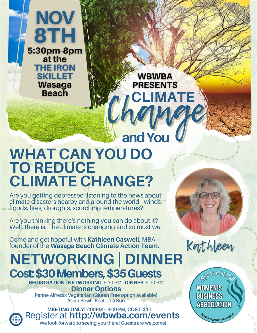 What can YOU do to reduce climate change? Are you getting depressed listening to the news about climate disasters nearby and around the world - winds, floods, fires, droughts, scorching temperatures? Are you thinking there's nothing you can do about it? Well, there is. The climate is changing and so must we. Come and get hopeful with Kathleen Caswell, founder of the Wasaga Beach Climate Action Team.
