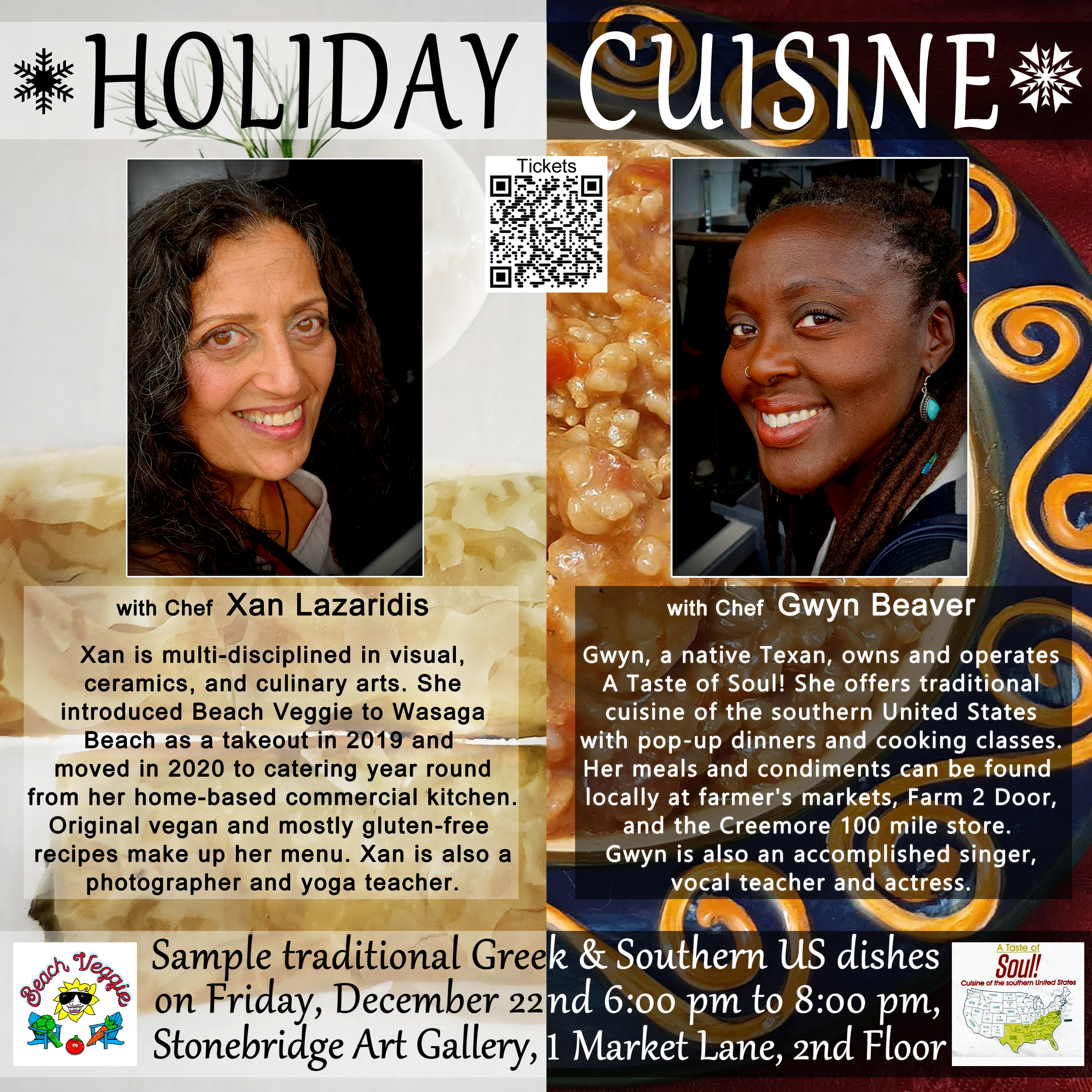Two local chefs, Gwyn Beaver of A Taste of Soul! and Xan Lazaridis of Beach Veggie, have created a cultural event of 10 different holiday dishes, five from the Southern United States and five from Greece respectively. Your taste buds will soar as you sample the traditional foods of these regions and learn the origins of each dish. Your chefs will have only samples for this event, but you can submit orders for full portions to be fulfilled in the new year.