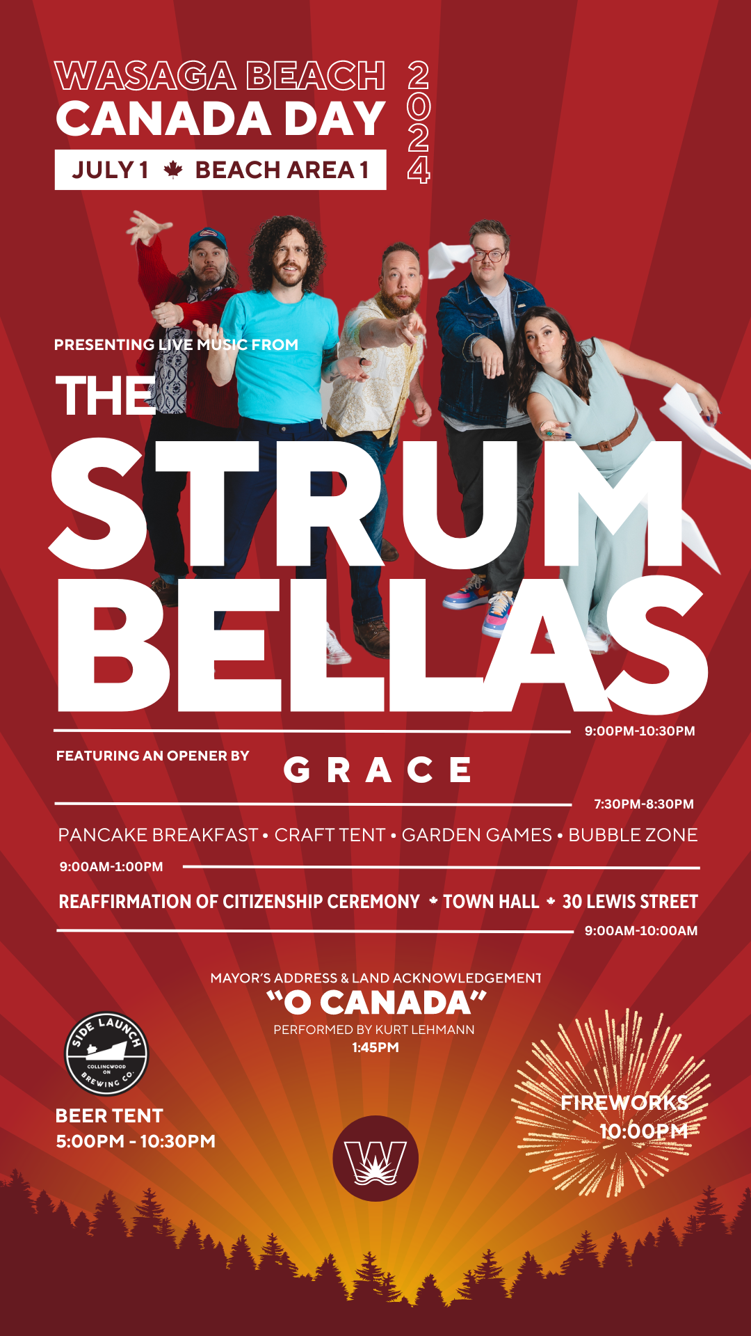 Join us on July 1st to celebrate Canada Day and kick off Wasaga’s 2024 live music summer festival season, featuring live performances by Juno Award-winners The Strumbellas and a soulful performance by Grace.