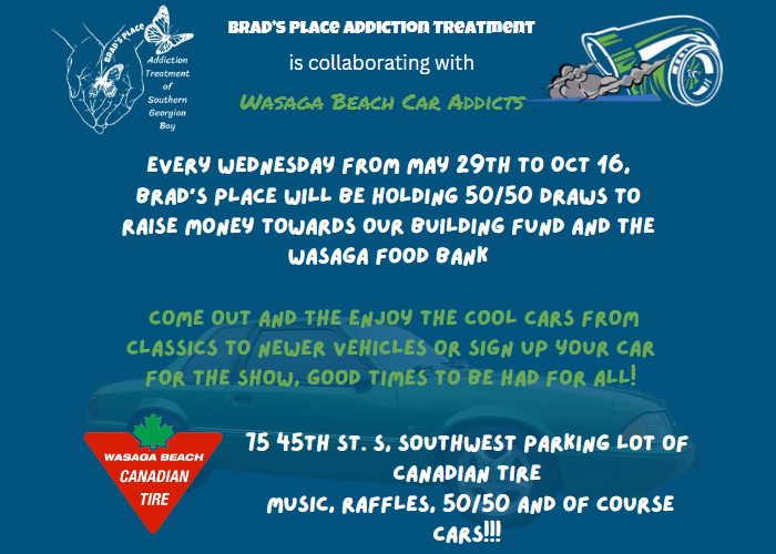 Brad's Place Addiction Treatment of Southern Georgian Bay are pleased to be partnering with WBCA - Wasaga Beach Car Addicts in support of the Wasaga Beach Food Bank. Car Shows are on Wednesdays 6 -9 until Oct 16. Proceeds of the 50/50 tickets are...